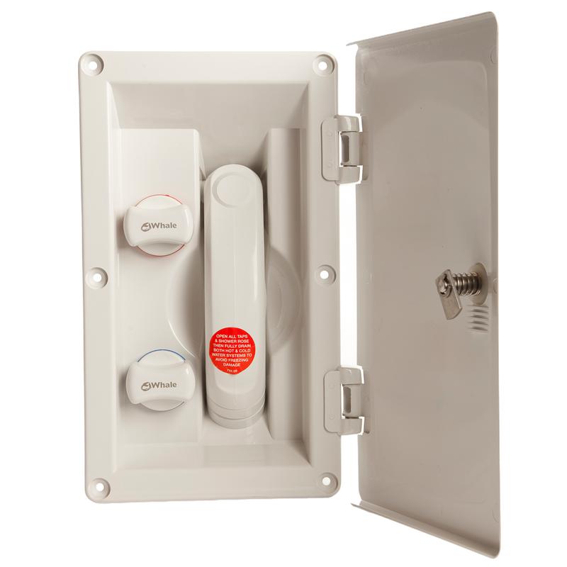 Duschmixer med lock för varm och kallvatten. Designad för att lätt kunna skölja sig på akterspegeln efter en simtur.