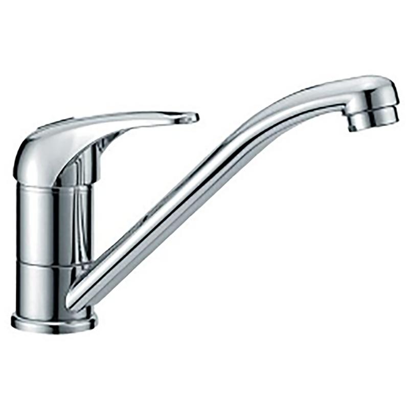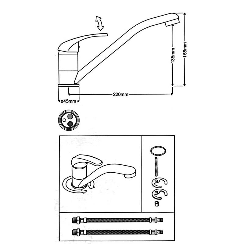 Engreppsblandare tillverkad i förkromad mässing. Blandaren är vridbar åt sidan. Se bild för paketets innehåll.