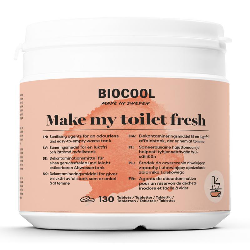 Biocool make my toilet fresh sönderdelar fekalier och toalettpapper samt bryter ned dålig lukt i toalettankar. Genom sina egenskaper som bryter ned dålig lukt istället för att dölja den behövs inga parfymer eller dofttillsatser. Produkten är tillverkad i Sverige och lätt nedbrytbar i naturen.