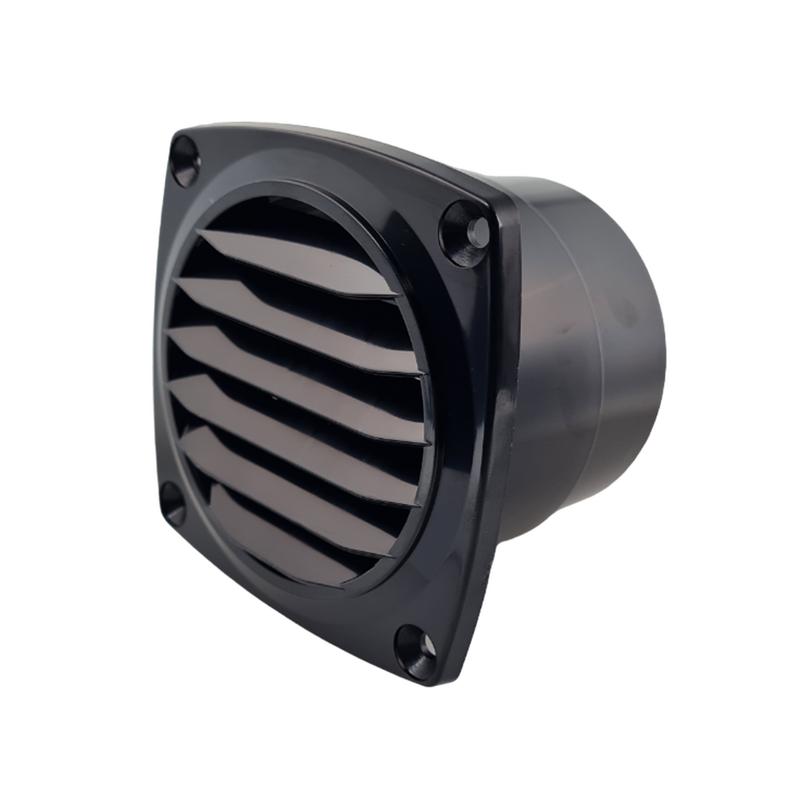 Svart ventil i plast med 75mm anslutning. 92x92mm