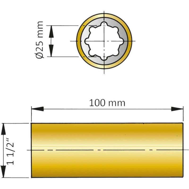 Vetus rullager för axel med 25 mm diameter är ett Cutlass-lager med hölje av mässing och en slitstark polyuretan-gummiinläggning. Lagrets yttre diameter är 1 ½ tum och det har en total längd på 100 mm.